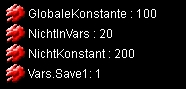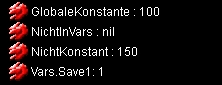 Hier kann man einiges feststellen, was sich nach dem Laden ändert: NichtInVars wird nach dem Laden nie auf einen Wert gesetzt und ist deshalb nil (not initialized (zu deutsch: nicht initialisiert)). NichtInGlobal (ups! NichtInVars ist ein Schreibfehler :) ) ändert sich ja im Laufe des Spiels, in einer Funktion. Stell dir nun vor du würdest nun einen Minutencounter haben, der sagt, ab welcher Minute die Gegner Soldaten bekommen und angreifen. Der wäre nun wieder auf dem Standardwert und das Script wäre verbuggt. Hier sieht man auch gut, dass Vars.Save nur Zahlen und auch nur Vars.Save1 bis Vars.Save9 speichert; Vars.Save2 und Vars.Save10 sind beide wieder auf unerwartete Werte gestoßen.