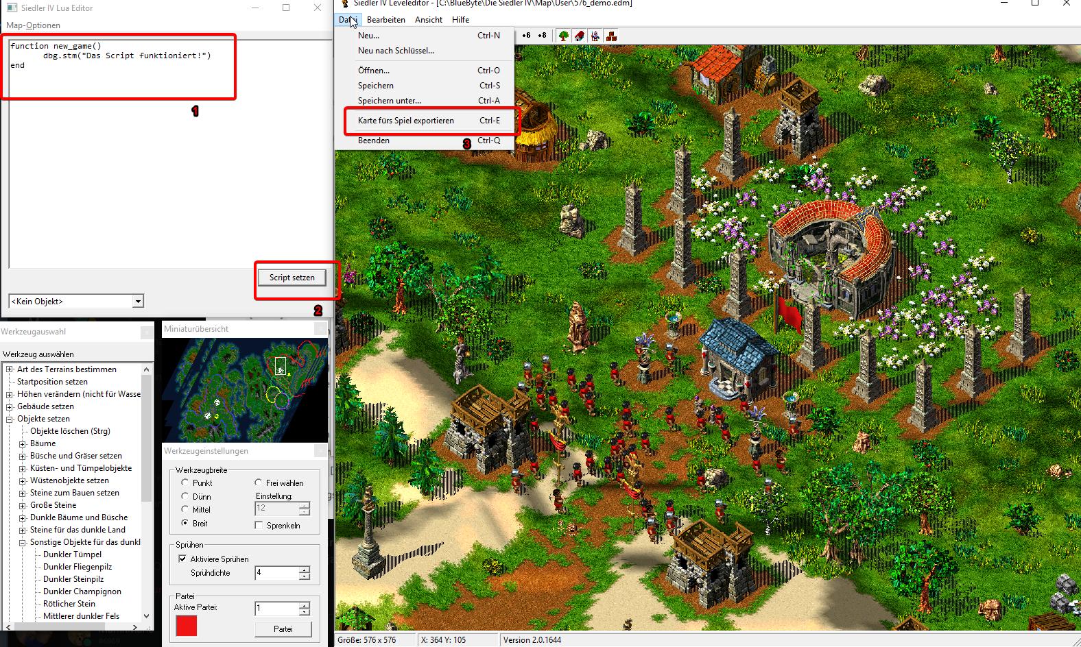 Sofern du den Script Editor noch nicht hast, kannst du ihn dir entweder zusammen mit Settlers United holen, oder einzeln auf der Homepage von MuffinMario oder auf der Einführungsseite Sobald du den Installationsschritten gefolgt bist, solltest du beim erneuten Öffnen des S4Editors ein weiteres Fenster bekommen mit einem großen leeren Textfeld, dieses zeigt dir das derzeitge Script der Map an bzw. kannst du das Script der geöffneten Map damit modifizieren. Zuerst öffnest du die Map, welche du bearbeiten möchtest. Sofern du bereits ein Script am schreiben warst und die geöffnete Map bereits ein Script beinhaltet, wirst du erstmal gefragt, ob du das Script im Script Editor zum Script der derzeitigen Map wechseln möchtest. Nach dem Öffnen der Map kannst du nun das Beispielscript einfügen, den Button "Script Setzen" drücken und die Map exportieren.