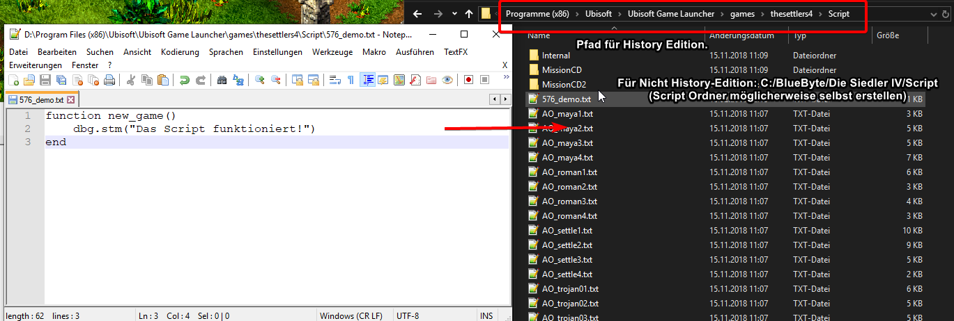 Nehmen wir für dieses Beispiel die Beispiel Editormap "576_demo.map". Das Script IN der .map Datei muss dafür leer sein. Um das Script nun der Map zuweisen zu können müssen wir eine Datei mit dem Namen "576_demo.txt" im Ordner ".../thesettlers4/Script/ (History Edition)" bzw. ".../Die Siedler IV/Script" (normale Version) erstellen. In diese Datei fügen wir unseren Scriptcode ein.